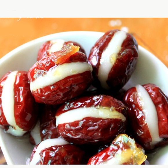 原料:红枣120克、糯米粉150克(热开水75克左右,用来和糯米粉)、白砂糖45克做法:1. 红枣浸泡软,洗干净,用剪刀剪开,挖去核。2. 将糯米用热开水和成面团,取一搓面团,大概2克,搓成小长条,塞入红枣中,捏紧。3. 锅入倒入水,加入白砂糖,煮到水开糖融化,加入糯米红枣,转最小火,煮10分钟即可。糖水苹果煎大枣 【缓解痛经】
