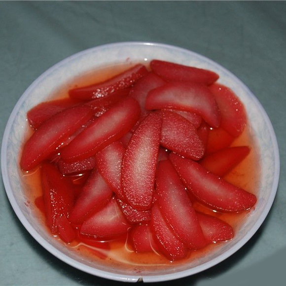 原料:鸭梨3个、红酒半瓶、冰糖做法:1. 梨去皮,把两个梨切成块后去掉里面的核。2. 把切好的梨和剩下的一整个梨放入锅中,倒入红酒,没过梨块,加入适量冰糖。3. 大火煮开后改中火再煮10分钟,中途可以给那个完整的梨翻身,凉后倒入玻璃容器里浸泡一晚即可。糯米酿红枣 【补中益气 养血安神】